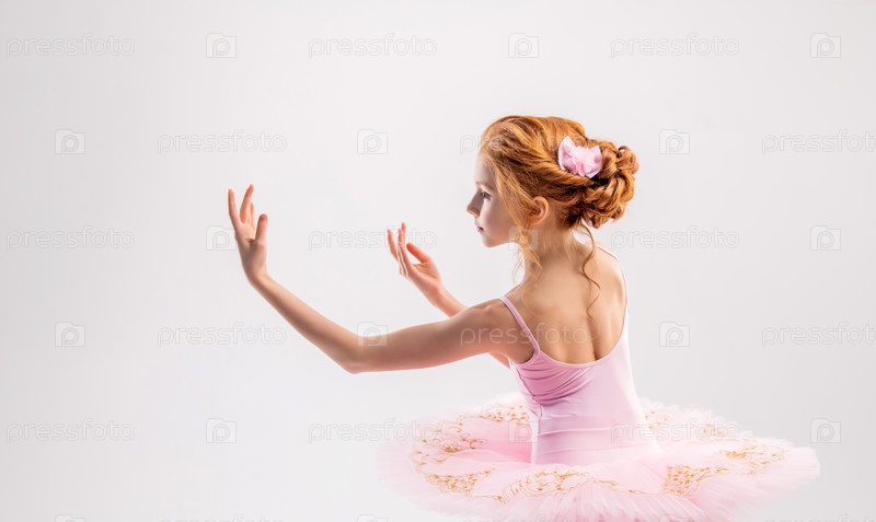 Портрет маленькой нежной рыжеволосой девочки в розовой пачке с пуантами, мечтающей стать балериной