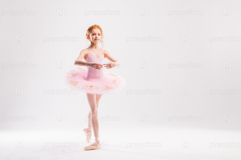 Маленькая балерина в розовой пачке студентка академии позирует на белом фоне