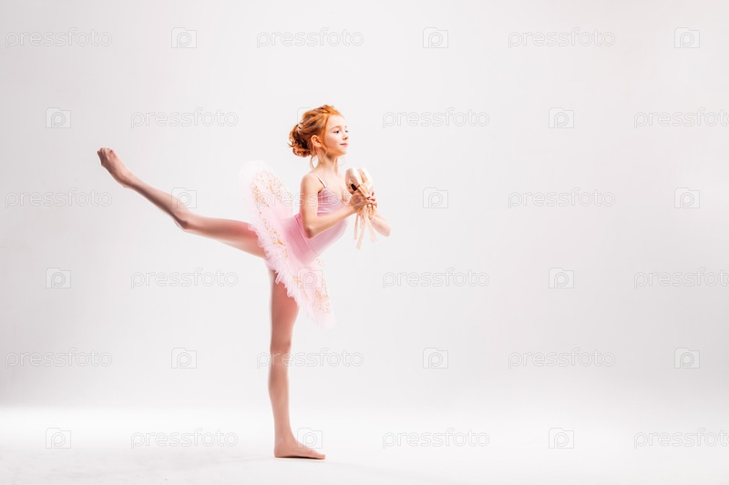 Маленькая балерина в розовой пачке студентка академии позирует на белом фоне