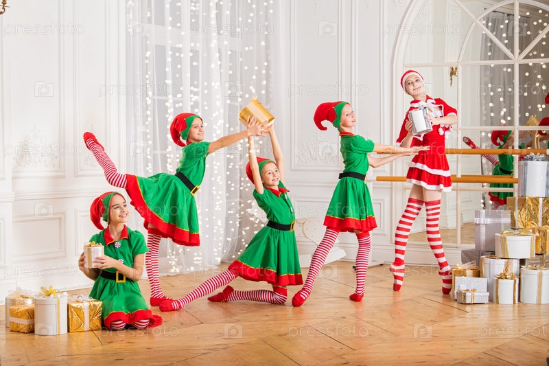 Дети, одетые как эльфы и тренирующиеся в балетном амбаре, смотрят на танцующую балерину, одетую как санта-клаус, в просторной белой студии