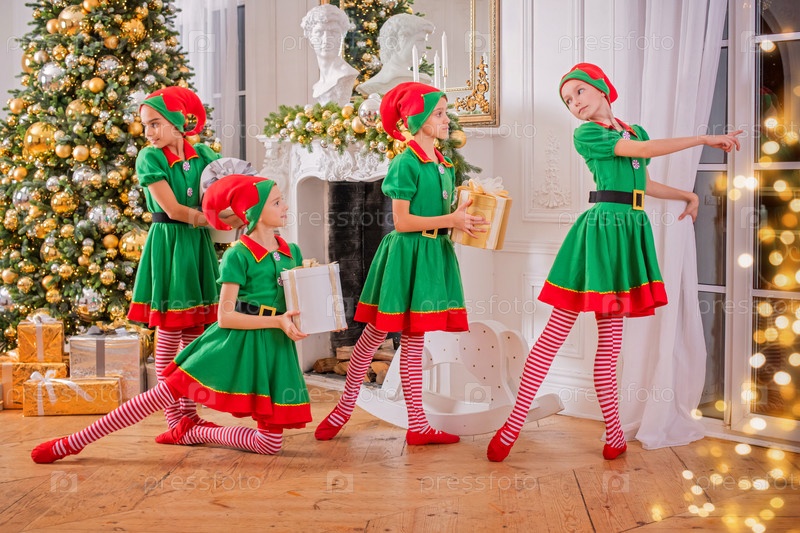Группа веселых счастливых детей, девочек, подружек, учениц профессиональной хореографической школы в костюмах эльфов танцуют с подарками на фоне елки