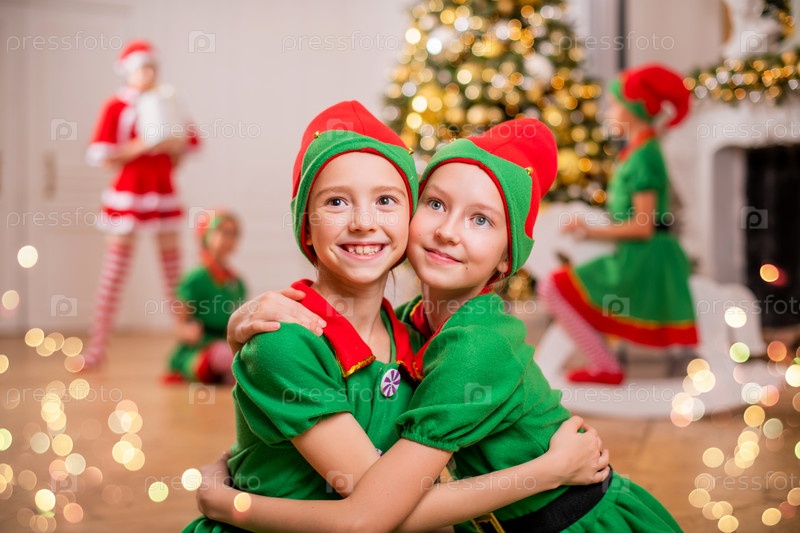 Две веселые счастливые подружки в костюмах эльфов Санты на фоне елки и других детей