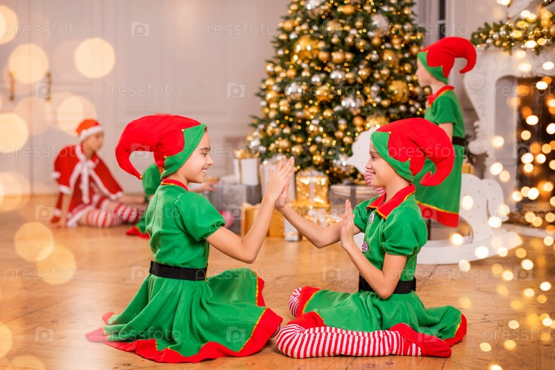 Две веселые счастливые подружки в костюмах эльфов Санты на фоне елки и других детей