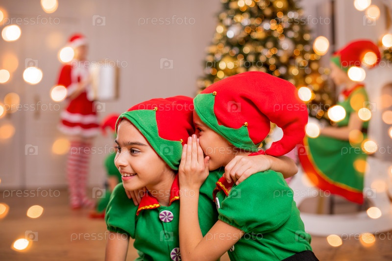 Две веселые счастливые подружки в костюмах эльфов Санты на фоне елки и других детей