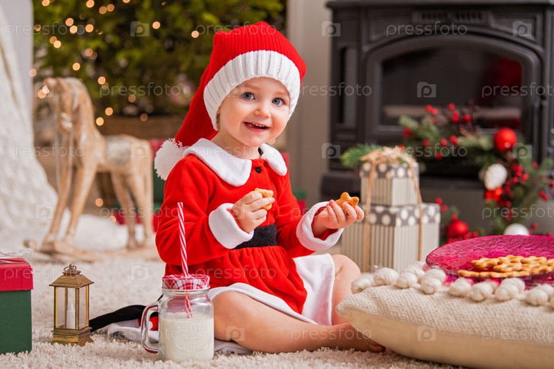 Веселая маленькая девочка в костюме Санта-Клауса ест печенье и пьет молоко в гостиной на фоне елки