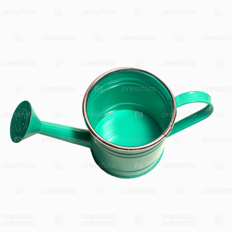 Зеленая металлическая декоративная лейка на белом фоне. Вид сверху. Крупный план
