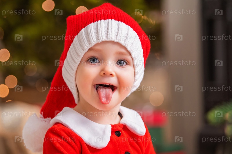 Портрет веселой маленькой девочки в костюме Санта-Клауса, показывающей язык в гостиной на фоне рождественской елки