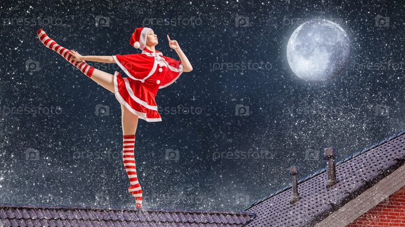 Танцующая балерина с подарком в руках в костюме Санта-Клауса на крыше дома в рождественскую ночь на фоне звездного неба