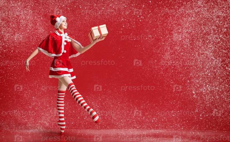 Танцующая балерина в пуантах с подарком в руках, одетая как Санта-Клаус на красном фоне