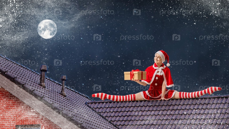 Балерина сидит в шпагате с подарком в руках, одетая как Санта-Клаус, на крыше дома в рождественскую ночь на фоне звездного неба