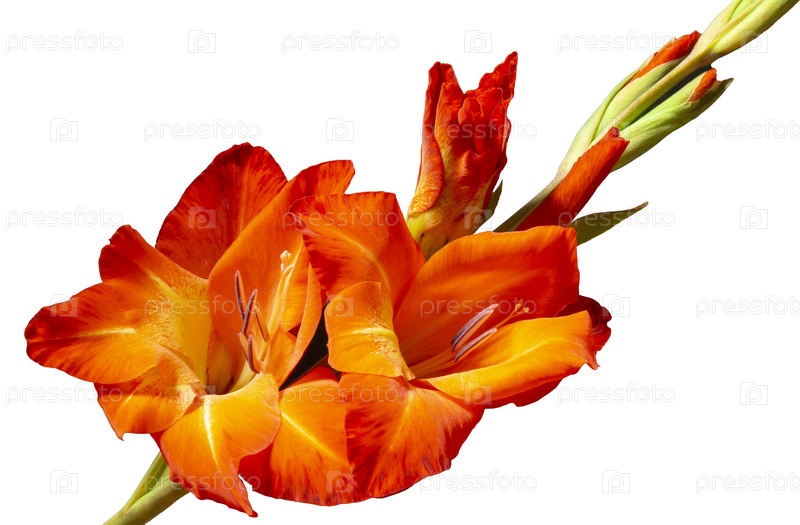 Красный гладиолус с зеленым листом на белом фоне