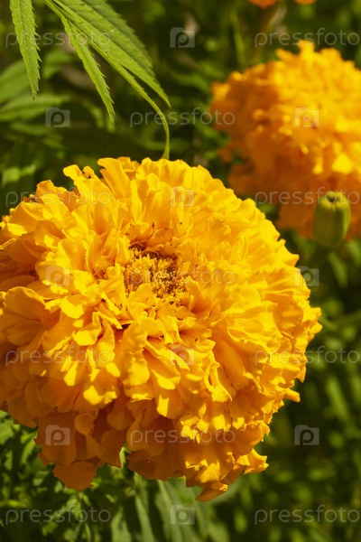 Tagetes erecta на фоне зеленого листа в летнем саду