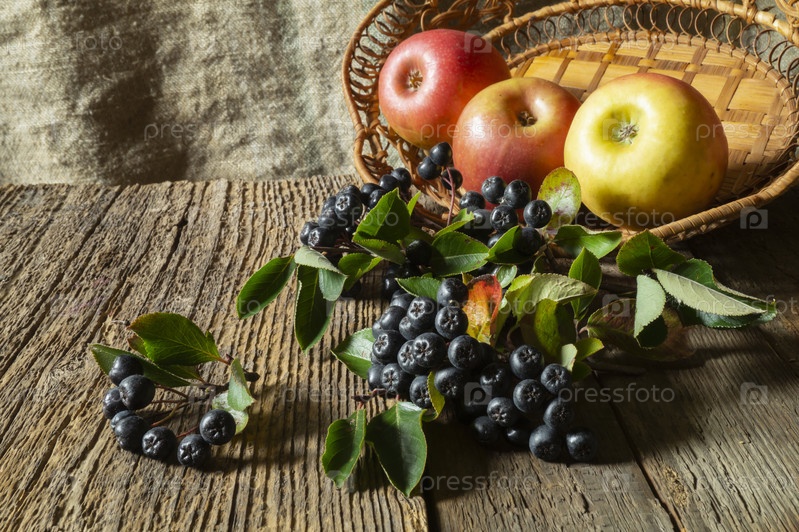 Яблоки в корзине и ветка рябины на деревянном столе