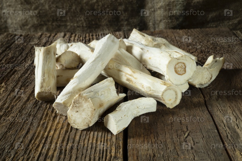 Свежий хрен на деревянном столе на кухне