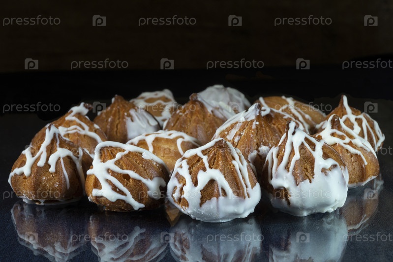 Заварные пирожные на стеклянном столе с отражением