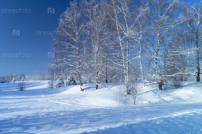 Зимний пейзаж с березовым лесом в солнечный день
