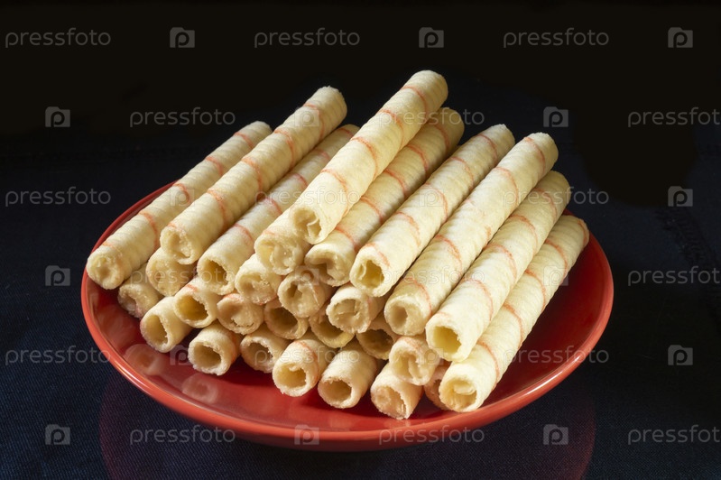 Сладкие палочки с начинкой в красной тарелке на черном фоне