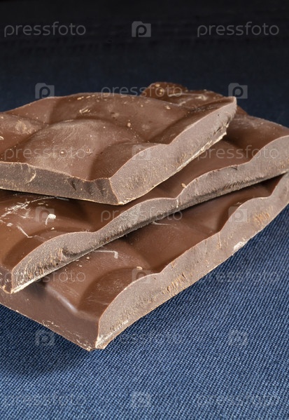 Кусочек темного шоколада лежит на синем столе