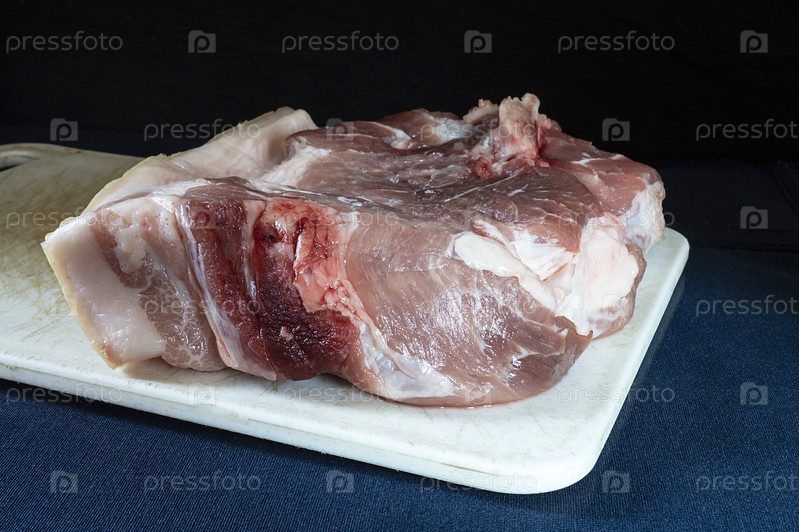 Кусок мяса свинины с белой доской на синем столе