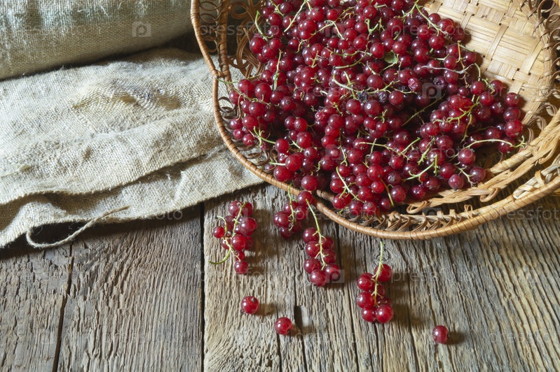Красная смородина в корзине на деревянном столе