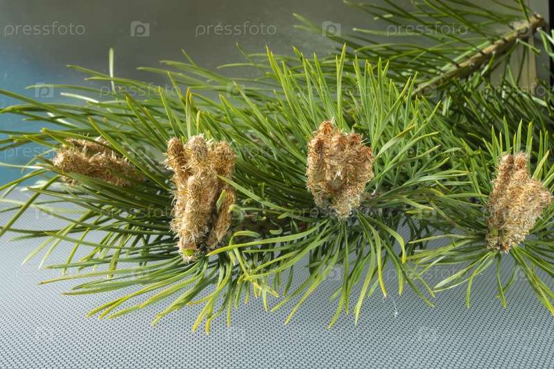 Зеленая ветка сосны весной на голубом фоне