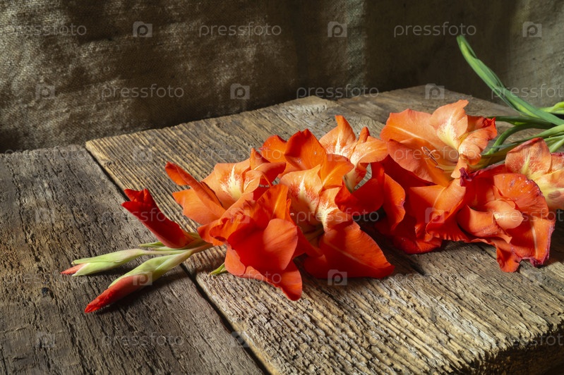 Красный гладиолус лежит на старом столе из досок