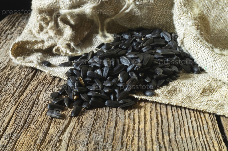 Семена подсолнуха из мешка на деревянном столе