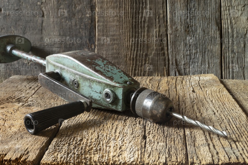 Старинная ручная дрель на столе в мастерской
