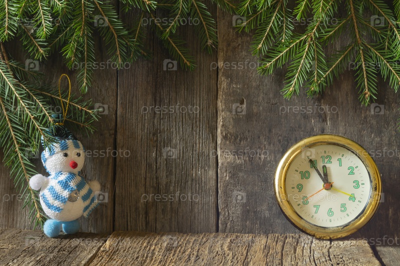 Часы и снеговик под елкой на деревянном фоне