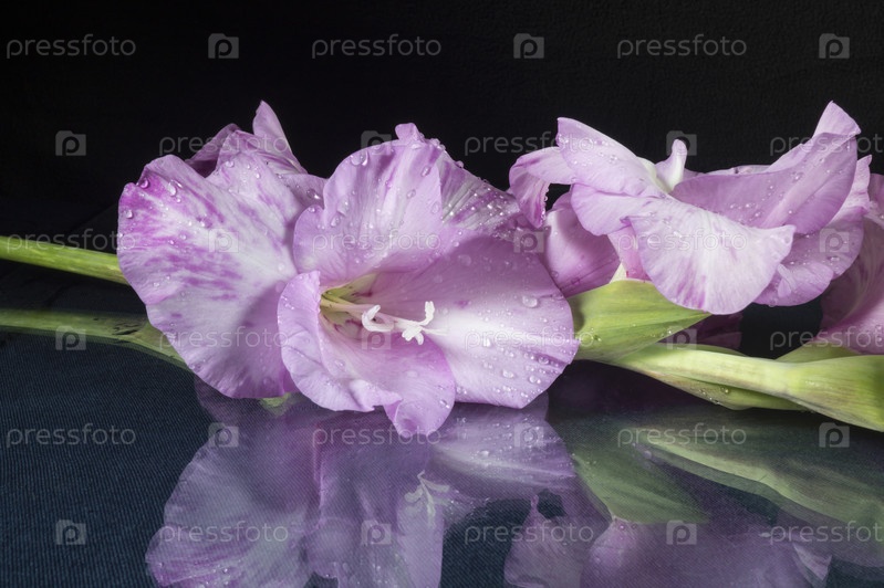 Красивый цветок гладиолуса лежит на столе с отражением