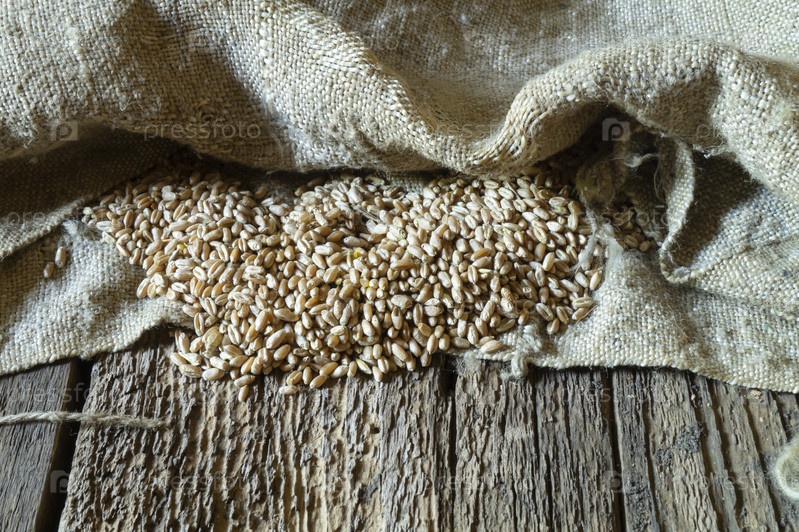 Зерно пшеницы с мешком на деревянном столе