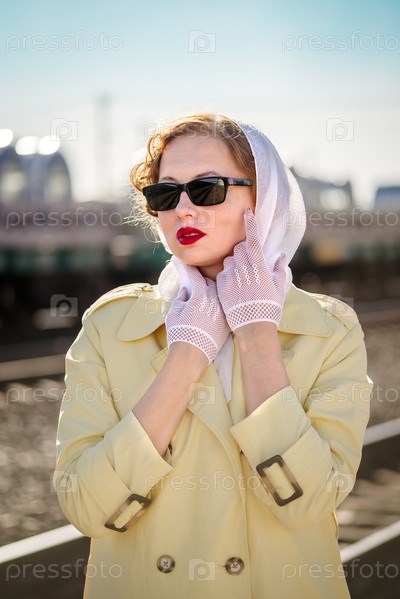Молодая женщина в желтом плаще и темных очках на перроне вокзала. Открытый портрет в стиле ретро