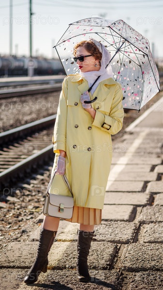 На перроне вокзала стоит молодая женщина в желтом плаще и темных очках, с зонтиком и сумочкой в руках. Открытый портрет в стиле ретро