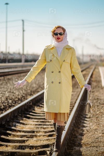 Молодая женщина в желтом плаще и темных очках с сумочкой в руках идет по рельсам. Портрет в стиле ретро на вокзале