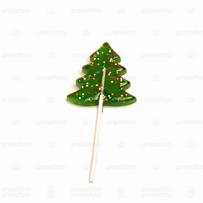 Конфеты на палочке в виде елки на изолированном белом фоне