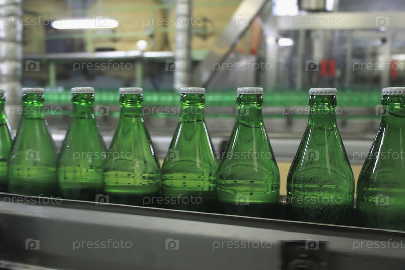 Автоматическая конвейерная лента с зелеными стеклянными бутылками для напитков. Концепция производства чистой бутилированной воды