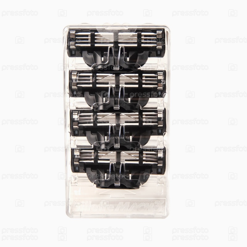 Картиз с лезвиями для мужской ручки бритвы Gillete Mach 3 в пластиковой коробке, изолированной на белом фоне