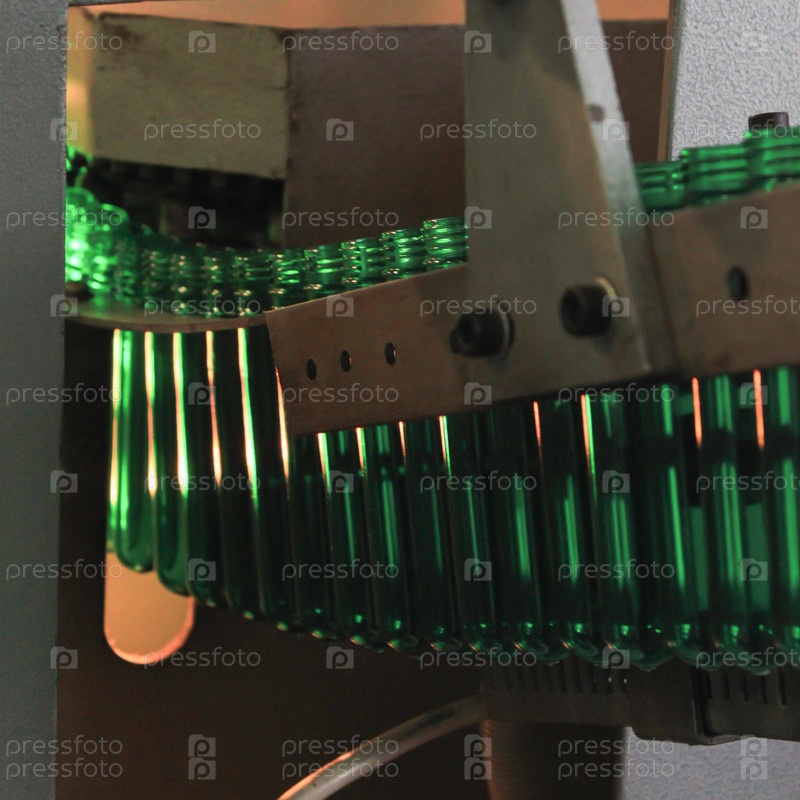 Преформы зеленых пластиковых бутылок для домашних животных на конвейере. Концепция производства бутилированной минеральной воды