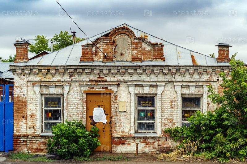 Оренбург, Россия - 04 сентября 2021 г.: Заброшенное старое кирпичное здание, бывший продуктовый магазин. улица Советская 128