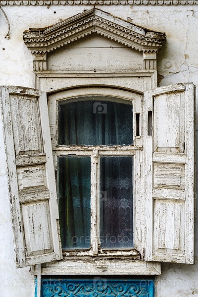 Окно с деревянными ставнями и резными рамами старинного дома, с элементами лепнины на фасаде. Снимок сделан в России, в городе Оренбург