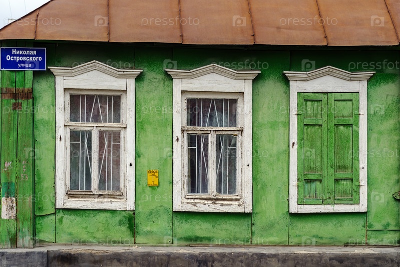 Оренбург, Россия - 04 сентября 2021 г.: Старый зеленый деревянный дом с белыми планками на окнах. улица Николая Островского