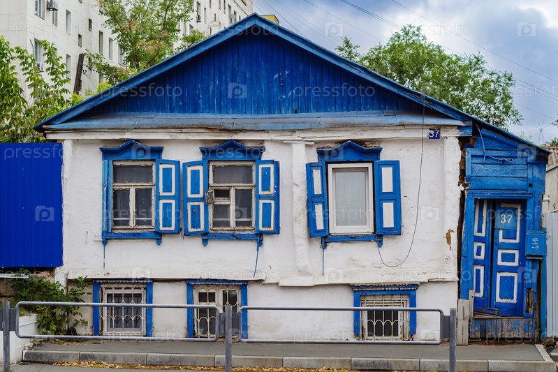 Оренбург, Россия - 04 сентября 2021 г.: Старый деревянный дом с наличниками на окнах и подвалом. Рыбаковская улица