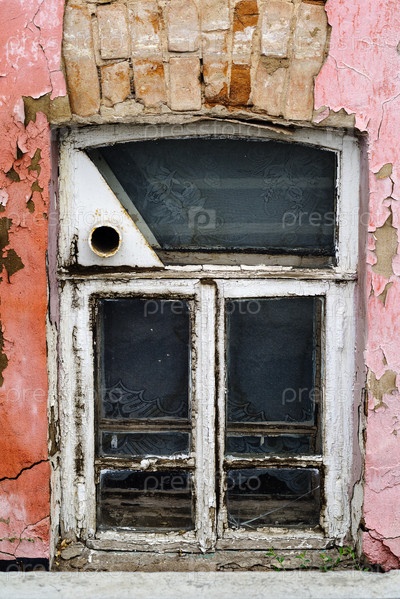 Деревянное окно с отверстием для самоварной трубы, в стене подвала старого дома. Снимок сделан в России, в городе Оренбург