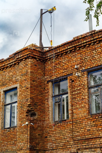 Подъемная лебедка с кабелем и панелью управления на крыше старого здания. Снимок сделан в России, в городе Оренбург