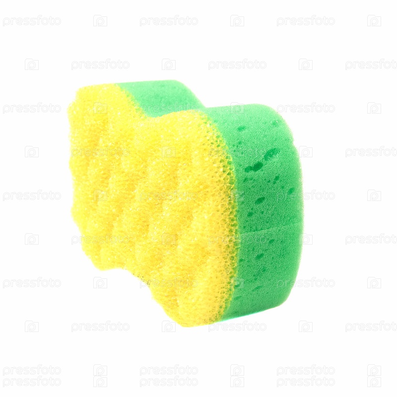 Зеленая и желтая губка для душа, изолированная на белом фоне. Вид сверху