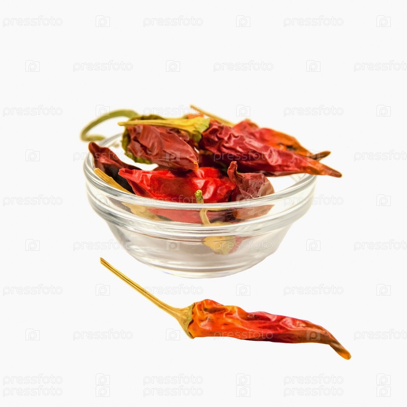 Сухой красный острый перец лежит в стеклянной миске и отдельно на изолированном белом фоне