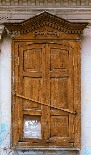 Резное окно с закрытыми деревянными ставнями на фасаде старого здания. Снимок сделан в России, в городе Оренбург