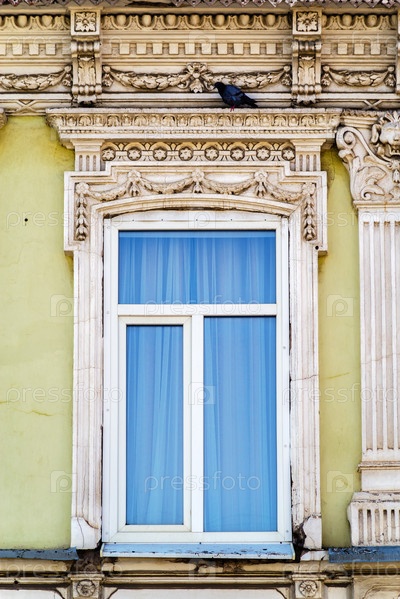 Пластиковое окно в стене старого здания с лепниной, фрагмент фасада. Снимок сделан в России, в городе Оренбург
