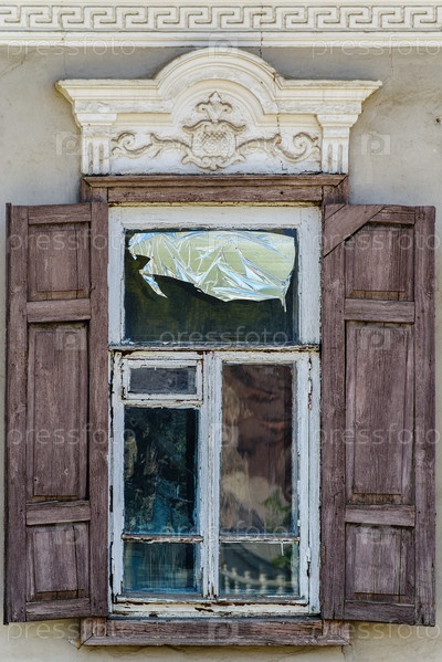 Окно с деревянными ставнями старого дома с лепниной. Снимок сделан в России, в городе Оренбург