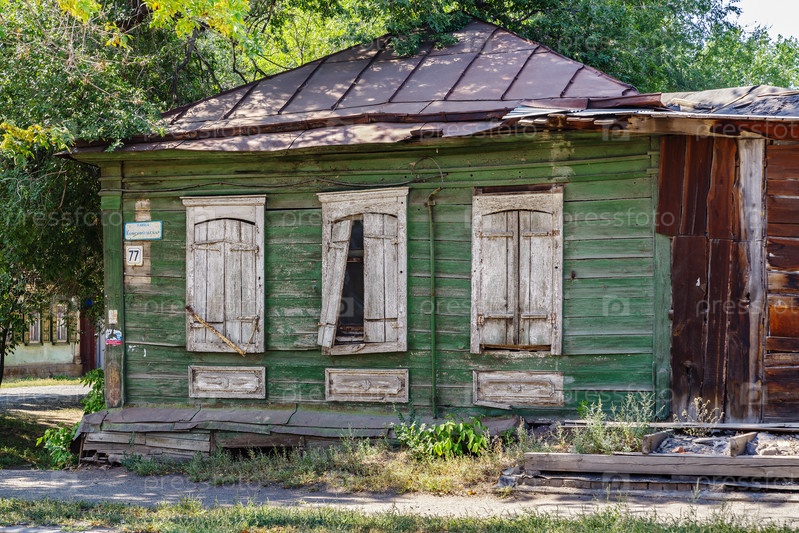 Оренбург, Россия - 29 августа 2021 г.: Старый заброшенный деревянный дом с закрытыми ставнями. улица Комсомольская 77